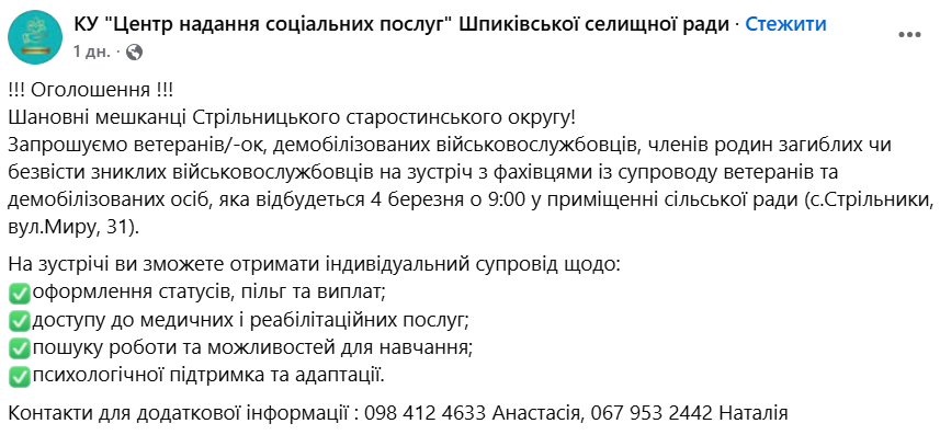 У селі Стрільники Шпиківської громади 4 березня відбудеться зустріч для ветеранів, демобілізованих військовослужбовців та родин загиблих або безвісти зниклих захисників. Учасники зможуть поспілкуватися з фахівцями із супроводу ветеранів та демобілізованих осіб і отримати консультації з актуальних питань.