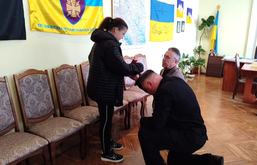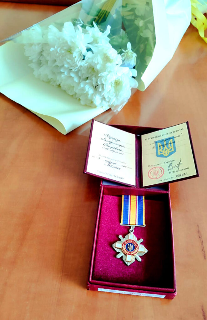 Державну нагороду дружині полеглого Захисника від імені Президента України Володимир Зеленський вручили начальник районної військової адміністрації Олександр Гаврилюк, заступник начальника РВА Сергій Чепернатий, Тульчинський міський голова Валерій Весняний та представник Тульчинського РТЦК та СП Тарас Квасюк.