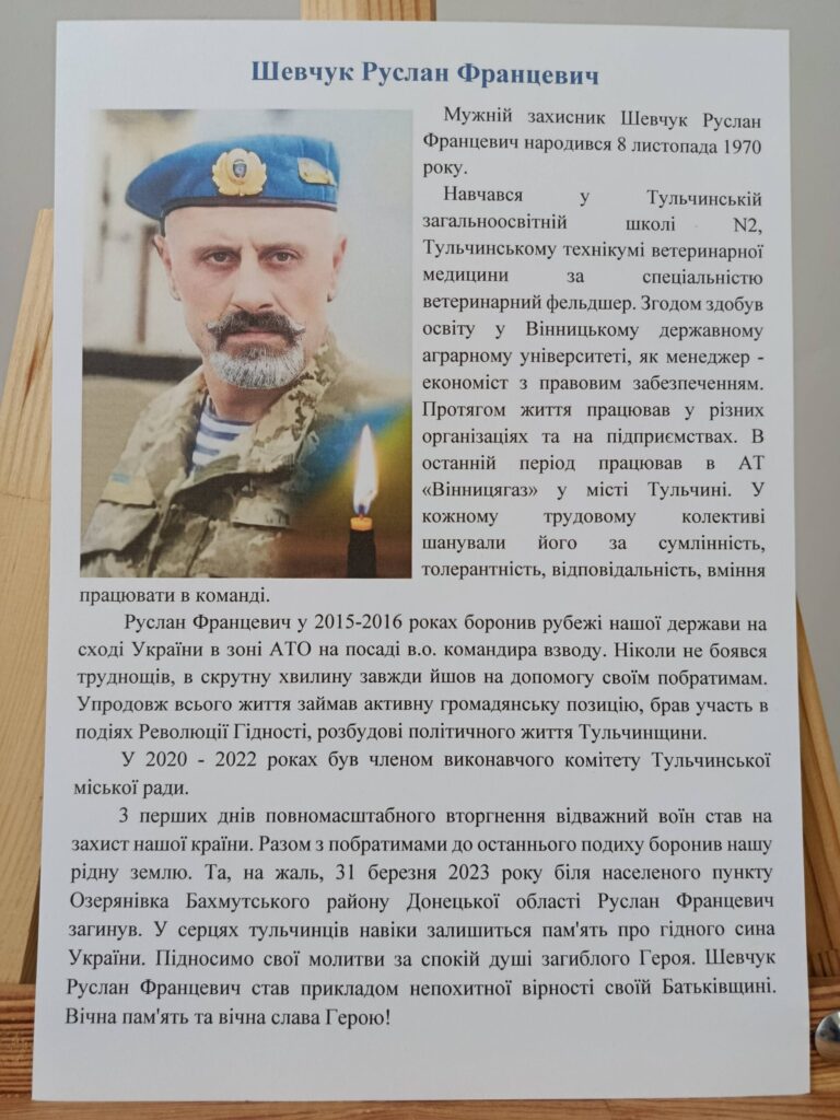 У Тульчинській публічній бібліотеці відкрили виставку «Пам’ять мужнього серця», присвячену загиблому військовому Руслану Шевчуку. Експозиція розповідає про його життєвий шлях, службу та відданість Україні.