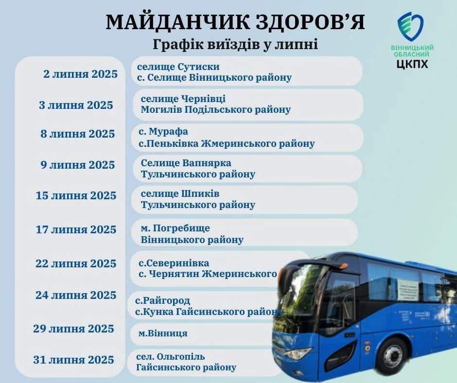 9 липня 2025 року “Майданчик здоров’я” працюватиме у селищі Вапнярка, а 15 липня — у селищі Шпиків Тульчинського району. Місцеві жителі зможуть пройти базові обстеження, отримати медичні поради та дізнатися більше про профілактику захворювань.