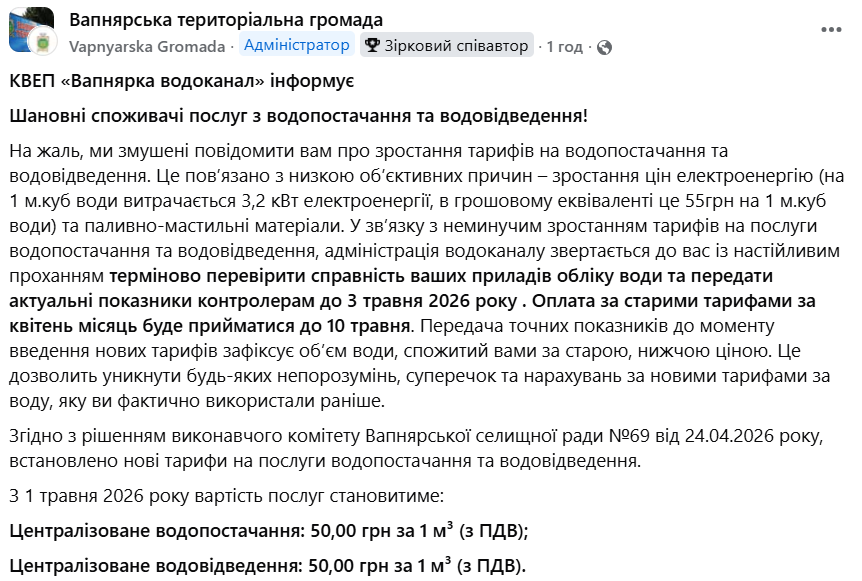 Із 1 травня 2026 року у Вапнярській громаді почнуть діяти нові тарифи на водопостачання та водовідведення. Водночас споживачам дали обмежений час, щоб передати показники лічильників і розрахуватися за старими цінами.
