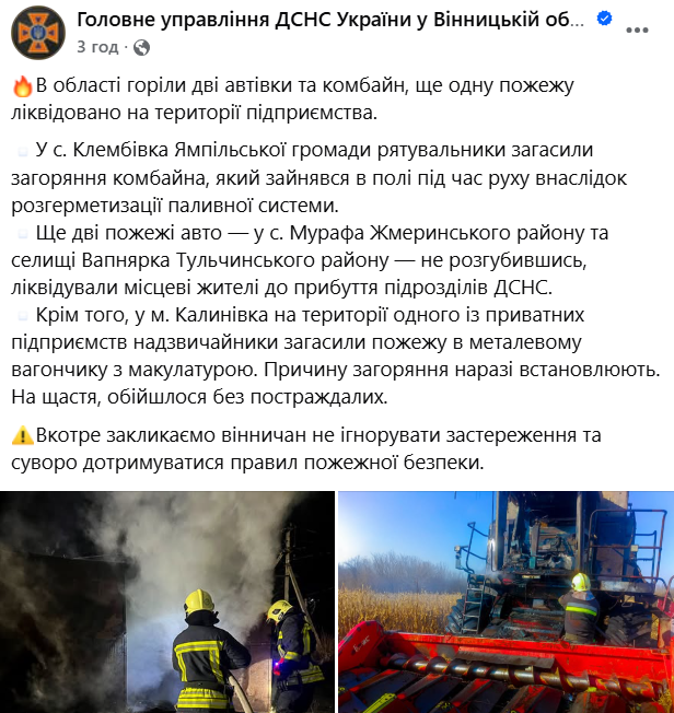 У селищі Вапнярка займання автомобіля ліквідували місцеві жителі ще до прибуття рятувальників. Аналогічна ситуація сталася і в селі Мурафа Жмеринського району, де люди самостійно впоралися з вогнем.