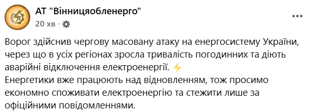 У “Вінницяобленерго” зазначили, що наразі енергетики працюють над відновленням. Жителів Вінниччини просять економно споживати електроенергію.