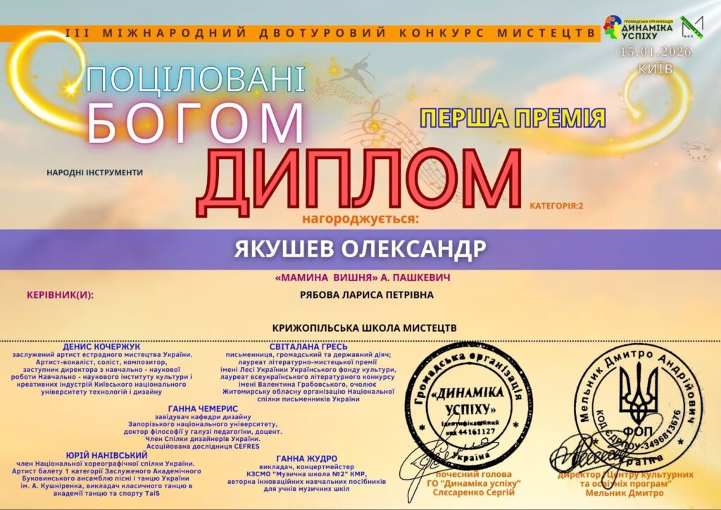 Учень відділу народних інструментів КУ «Крижопільська школа мистецтв» Олександр Якушев здобув почесні нагороди на ІІІ Міжнародному конкурсі мистецтва «Поціловані Богом». Повідомляють на сторінці школи.