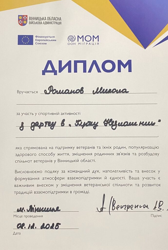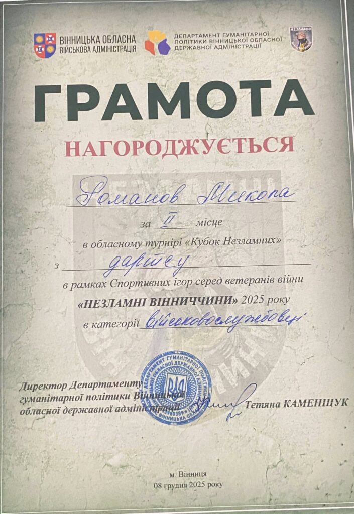 Особливим досягненням став результат Миколи Романова, який виборов ІІ місце у змаганнях з дартсу. Ця нагорода стала не лише особистим спортивним успіхом ветерана, а й приводом для гордості всієї Піщанської громади.