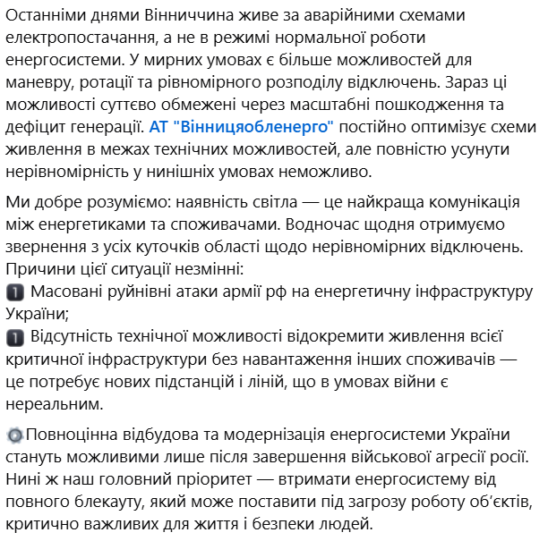 “Останніми днями Вінниччина живе за аварійними схемами електропостачання, а не в режимі нормальної роботи енергосистеми. У мирних умовах є більше можливостей для маневру, ротації та рівномірного розподілу відключень. Зараз ці можливості суттєво обмежені через масштабні пошкодження та дефіцит генерації. Ми добре розуміємо: наявність світла — це найкраща комунікація між енергетиками та споживачами. Водночас щодня отримуємо звернення з усіх куточків області щодо нерівномірних відключень”, — йдеться у повідомленні.