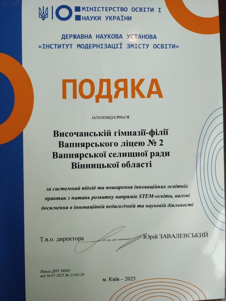 Особливу відзнаку отримала Височанська гімназія-філія Вапнярського ліцею №2. Заклад був нагороджений Подякою від Державної наукової установи «Інститут модернізації змісту освіти» Міністерства освіти і науки України за системний підхід, активне поширення інноваційних освітніх практик у напрямку STEM-освіти та вагомі результати педагогічної і наукової діяльності. Повідомляють на сторінці ліцею.