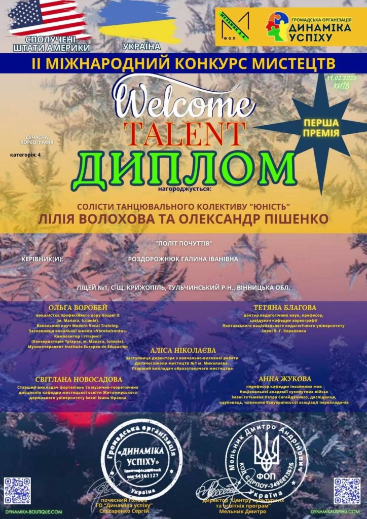 Солісти танцювального колективу «Юність» Лілія Волохова та Олександр Пішенко вибороли перше місце на ІІ Міжнародному конкурсі мистецтв.