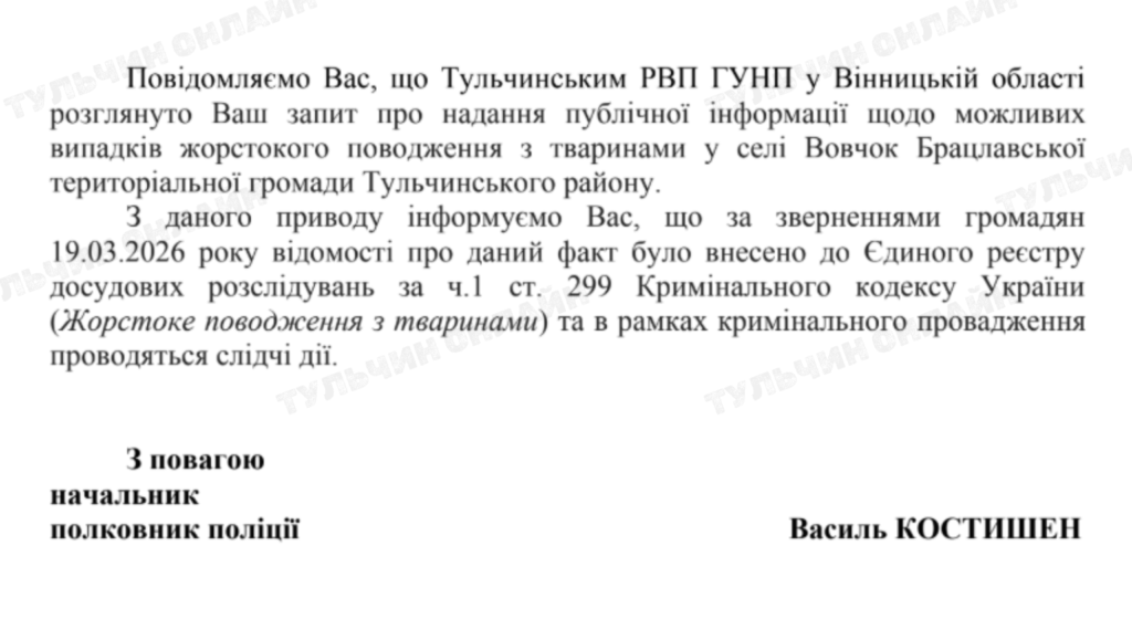Редакція «Тульчин онлайн» отримала офіційну відповідь від поліції щодо ситуації з можливим жорстоким поводженням з тваринами у селі Вовчок Брацлавської громади. Інформацію надали у відповідь на наш журналістський запит.