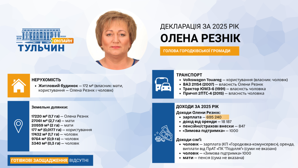 Сільський голова Городківської громади Олена Резнік подала декларацію за 2025 рік у березні 2026-го. У документі зазначені доходи родини, житло, транспорт і кілька земельних ділянок у Тульчинському районі.