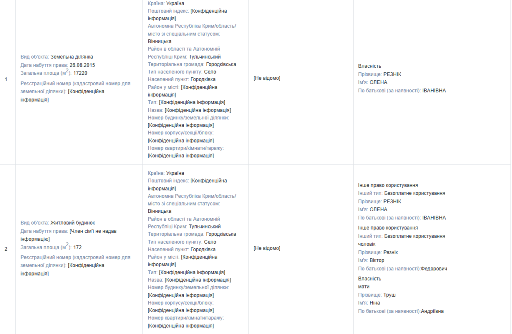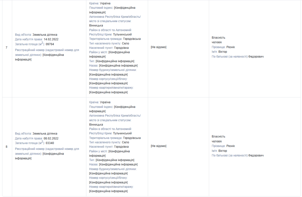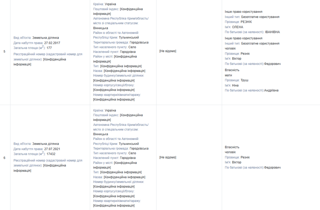 - 17 220 м² (1,7220 га) — у власності Олени Резнік