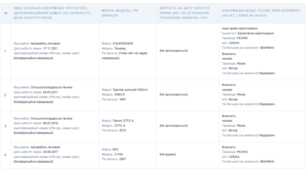 - автомобіль Volkswagen Touareg (2021 року) — у користуванні Олени Резнік, власник чоловік