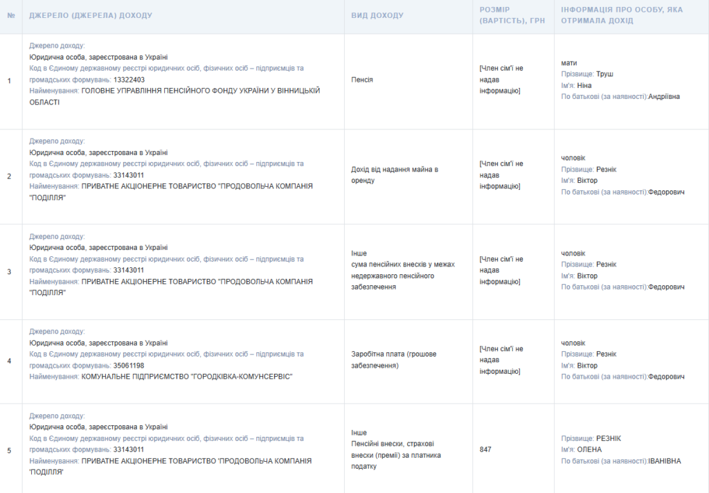 Чоловік посадовиці Віктор Резнік отримував доходи від оренди майна, заробітну плату в КП «Городківка-комунсервіс» та інші нарахування від ПрАТ «Продовольча компанія “Поділля”». Суми у декларації не зазначені. Також він задекларував 1000 грн «Зимової підтримки».